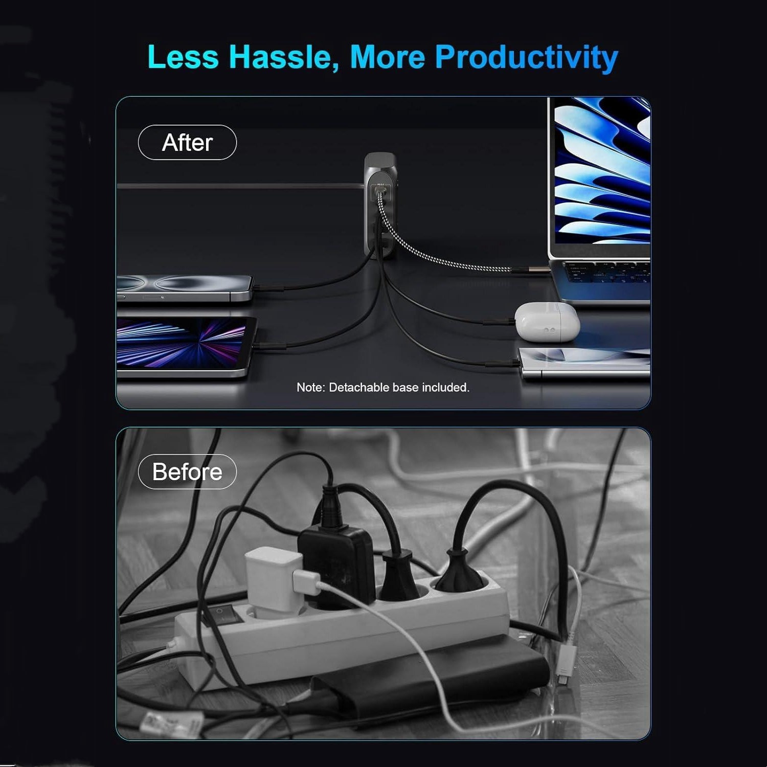 - Efficient and Intelligent Power Distribution: Upgraded independent 5-way circuit design intelligently matches current when charging multiple devices at the same time to ensure optimal charging power, which protecting device battery and improving battery life. USB-C1 And USB-C2 Support 140W max, USB-C3 Support 30W max, USB-A1Support 30W max, USB-A2 Support 18W max.