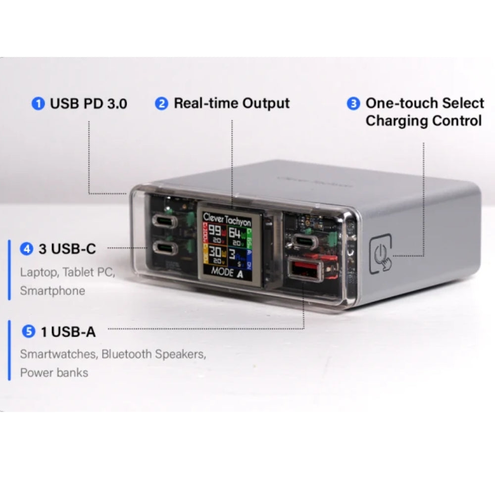 - The USB fast charger block has A/B/C modes and displays the real-time charging power of the four ports on the screen. With fixed power output, USB C charging station can be used in many situations without charging restart