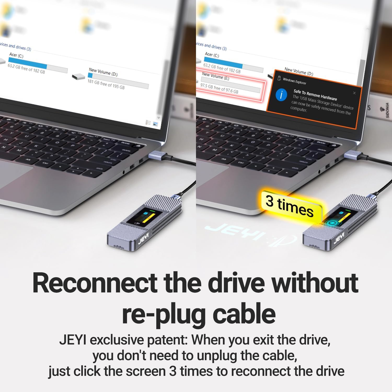 - This JEYI M2 enclosure supports hard disk status monitoring, displaying information such as the Current USB Protocol Speed, Hard Disk Model, Partition Status, Current Temperature, M..2 SSD Health Percentage, Total Data Write and Read Volumes, Total Power-on Volumes, Unsafe Shutdown Volumes, and Power-on Cycles. With the provided data, you can check the hard disk information at any time to ensure its safety.