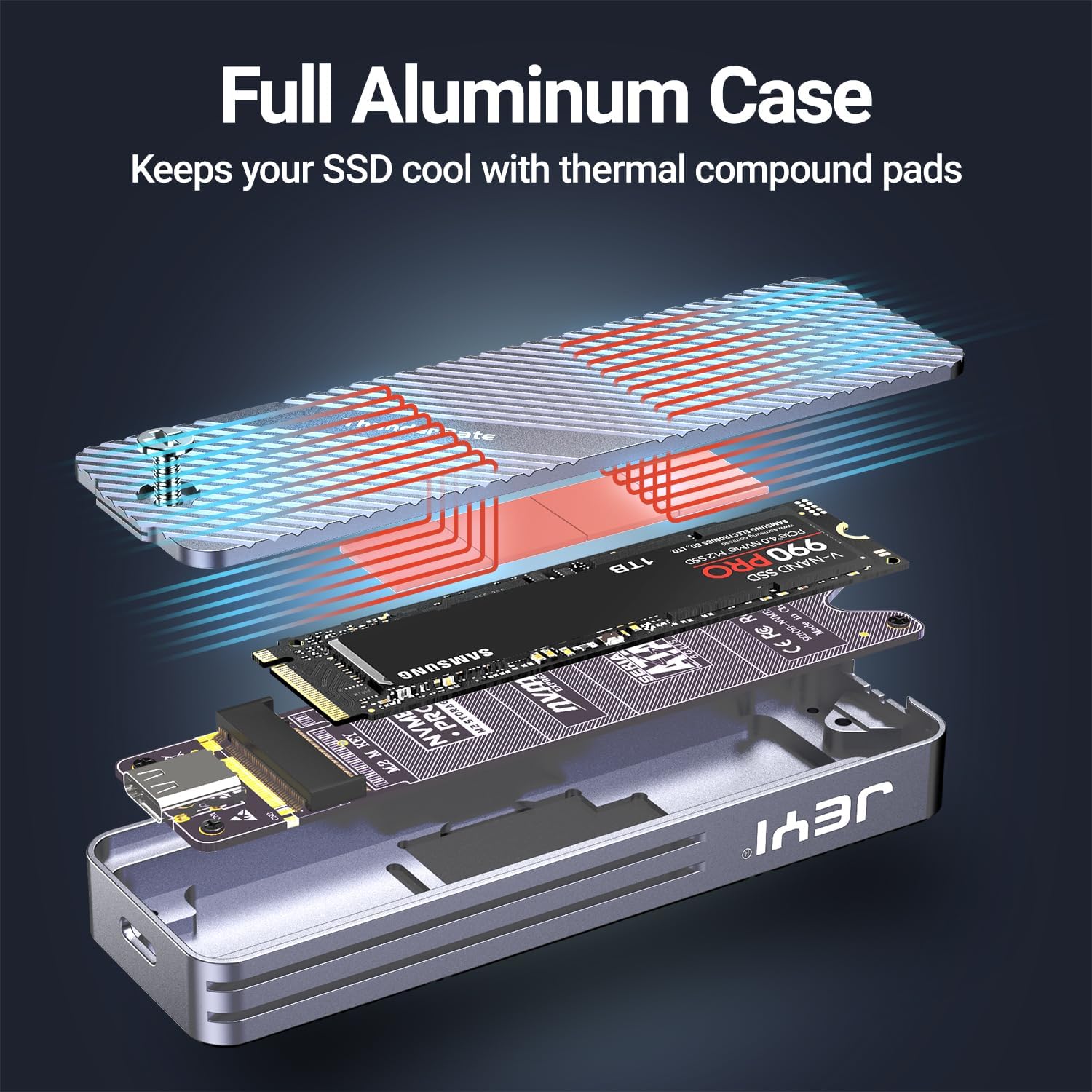 - The JEYI m.2 external enclosure improved heat dissipation, the m.2 usb enclosure features an aluminum alloy CNC shell with multiple grooves on the surface matched with thermally conductive silicon pads to maximize cooling capabilities.